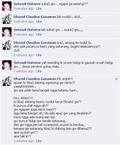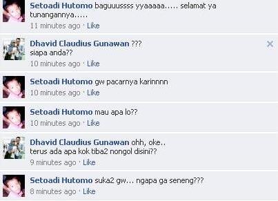 Dua hari yang lalu, tiba-tiba dateng seorang cowo di akun facebook gw, ngaku klo dia pacarnya si mantan :capedeh.. Well, pertama-tama kaget juga yaa, ni orang tau gw dari mana, dan ada urusan apa coba tiba-tiba gitu.. Dari komen pertama dia di facebook gw, feeling gw udah kaga enak tuh (mana lagi siap-siap pergi buat nyari kerja lagi gw ckck).. makin lama, kok nih orang makin rusuh gak jelas.. Laahh, dalem hati gw ini orang udah sarap kali yaa?? hahaa